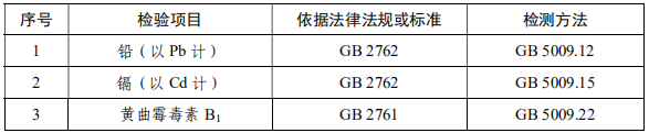 GB 2761 食品安全國家標準 食品中真菌毒素限量 GB 2762 食品安全國家標準 食品中污染物限量 GB 5009.12 食品安全國家標準 食品中鉛的測定 GB 5009.15 食品安全國家標準 食品中鎘的測定 GB 5009.22 食品安全國家標準 食品中黃曲霉毒素 B 族和 G 族的測定